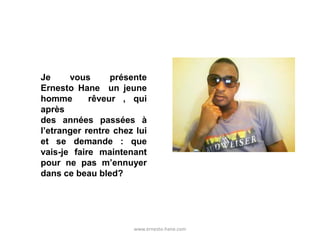 Le document présente le parcours d'Ernesto Hane, un jeune homme passionné par le marketing qui décide de créer un blog pour se faire connaître. Il souligne l'importance du référencement pour la visibilité de son blog sur Internet, avec des stratégies clés à appliquer pour réussir, telles que la création de contenu de qualité et l'acquisition de liens. Finalement, le blog d'Ernesto devient un succès, attirant des clients et lui permettant de vivre de sa passion.