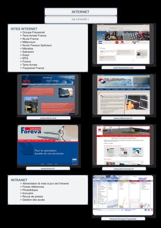 Le document détaille les événements, séminaires et supports de communication organisés par le groupe Freyssinet, y compris des conférences internes et des salons. Il présente également les solutions de renforcement des structures proposées par Foreva, mettant en avant des produits spécifiques comme le tissu composite stratifié en situation in situ. Enfin, il décrit les pratiques de marketing et de communication, ainsi que les brochures et publications réalisées pour promouvoir les activités du groupe.