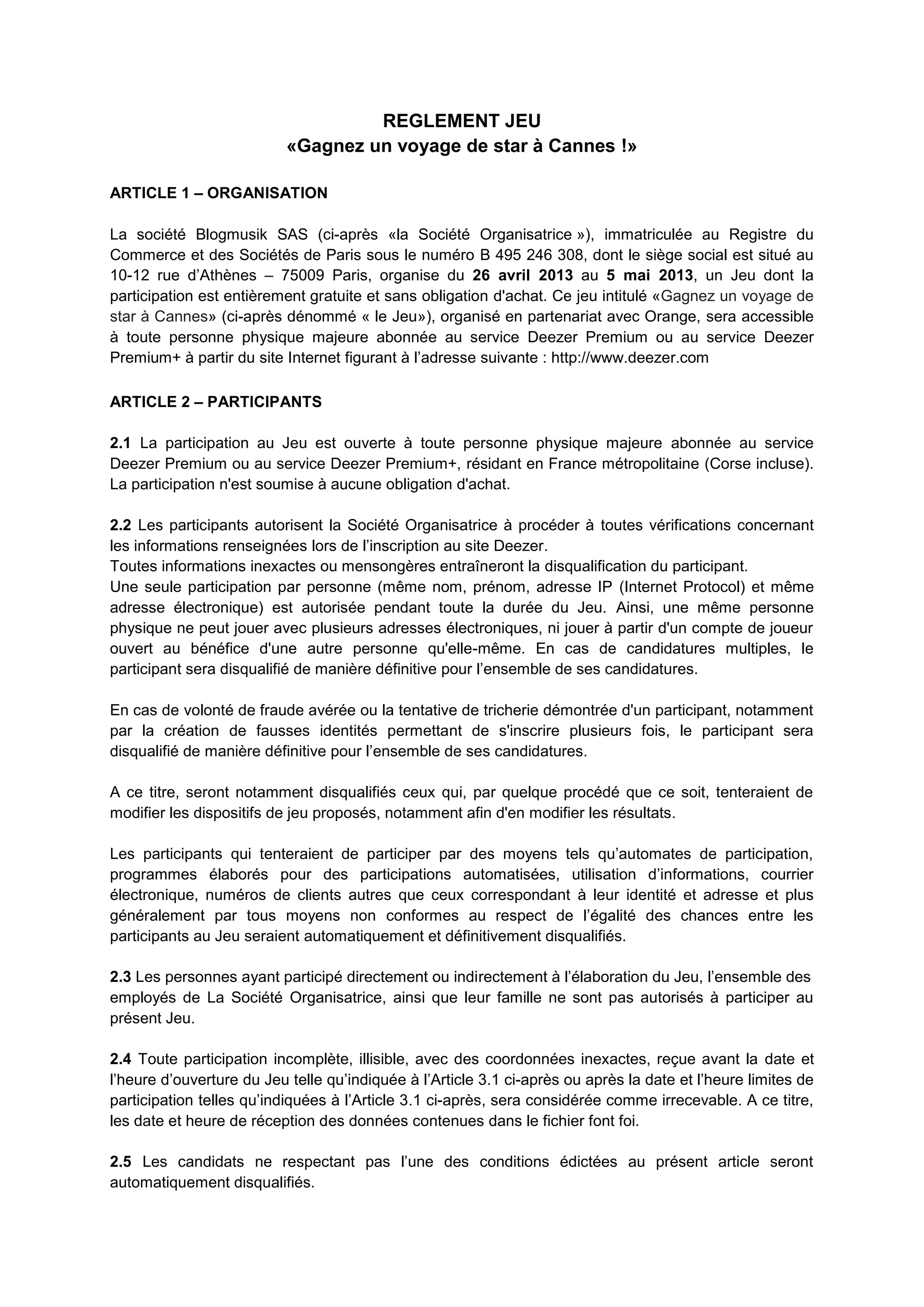 La société Blogmusik SAS organise un jeu gratuit intitulé "Gagnez un voyage de star à Cannes" du 26 avril au 5 mai 2013, ouvert aux abonnés majeurs de Deezer Premium ou Premium+. Les participants doivent respecter des conditions strictes d'inscription et une seule participation par personne est autorisée, avec un tirage au sort prévu le 6 mai 2013 pour désigner le gagnant et les réserves. Le gagnant recevra un pack VIP pour le festival de Cannes, mais la société se dégage de toute responsabilité en cas de problèmes techniques ou d'invalidité des coordonnées fournies.
