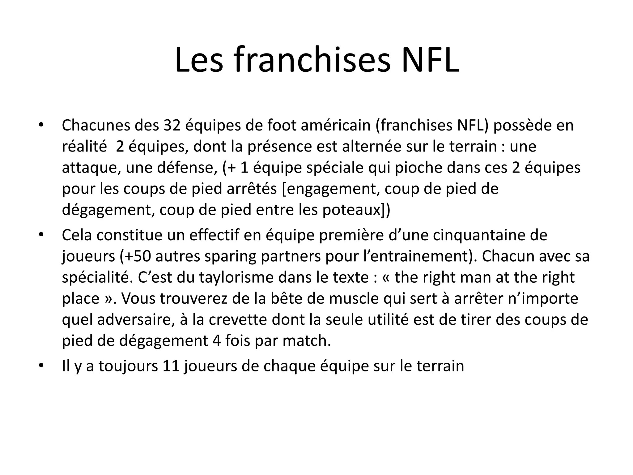 Le document décrit le fonctionnement des franchises de la NFL, où chaque équipe a une attaque et une défense, avec des règles spécifiques sur le jeu. Les différentes positions, tels que quarterback ou running back, sont expliquées en fonction de leurs rôles et caractéristiques physiques. Il aborde également le système de scoring et les coups de pied arrêtés dans le jeu.