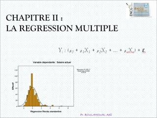 Le document présente une analyse des données statistiques, en particulier la régression multiple pour évaluer la relation entre des variables telles que l'éducation et le salaire. Il décrit également des étapes méthodologiques pour tester la pertinence des modèles, l'ajustement, et la contribution des variables indépendantes. Enfin, il aborde l'importance de vérifier les hypothèses sous-jacentes et d'évaluer l'impact des valeurs extrêmes sur la qualité du modèle.