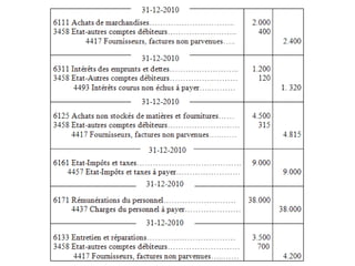Le document traite des régularisations comptables nécessaires à la fin d'un exercice pour aligner les comptes de charges et de produits à la réalité économique. Il aborde les charges et produits constatés d'avance, les charges à payer et produits à recevoir, ainsi que les ajustements des créances et dettes en monnaies étrangères. Des exemples pratiques illustrent la gestion des opérations comptables pour garantir la précision des rapports financiers.