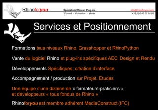 Rhinoforyou est un expert en logiciels Rhino et plug-ins, offrant des services de conseil, formation et vente. L'entreprise se spécialise dans des développements spécifiques, la création d'interfaces et l'accompagnement sur des projets variés, ainsi que la formation pour tous niveaux sur Rhino, Grasshopper et Rhinopython. Avec une équipe d'experts, Rhinoforyou collabore avec des acteurs du secteur AEC pour optimiser la conception, l'ingénierie et la construction.