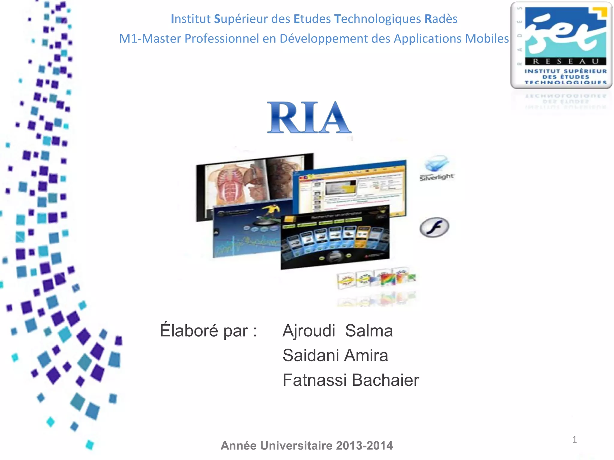 Le document présente les Rich Internet Applications (RIA), qui surmontent les limitations des applications web traditionnelles en offrant des interfaces utilisateur interactives et dynamiques. Les RIA renforcent l'expérience utilisateur grâce à des fonctionnalités telles que des animations, des composants riches et une exécution asynchrone, tout en étant déployées directement via le web ou en local dans un environnement sécurisé. Cependant, le document évoque également des inconvénients, comme les défis de déploiement et d'apprentissage de nouvelles technologies associées aux RIA.