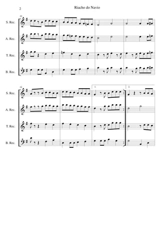 Le document semble être une partition musicale pour flûte à bec, contenant des notations pour différents types de flûtes (soprano, alto, ténor et basse). Il inclut des instructions et des indications rythmiques sans texte explicatif, se concentrant sur la notation musicale. La partition fait référence à 'Riacho do Navio', une œuvre de Luiz Gonzaga et Zé Dantas.