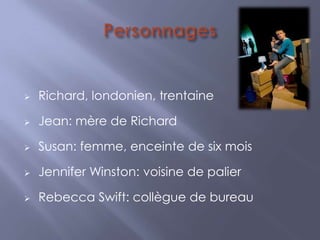 Le document présente une analyse de personnages autour de Richard, un Londonien dans la trentaine, et de son entourage, notamment sa mère Jean, sa femme enceinte Susan, sa voisine Jennifer, et sa collègue Rebecca. Les interactions se déroulent dans divers lieux urbains de Londres, tels que l'appartement de Richard et la maison de sa mère à Brixton. L'approche est à la fois chronologique et psychologique, mettant en lumière les expériences vécues à travers les voix de femmes.