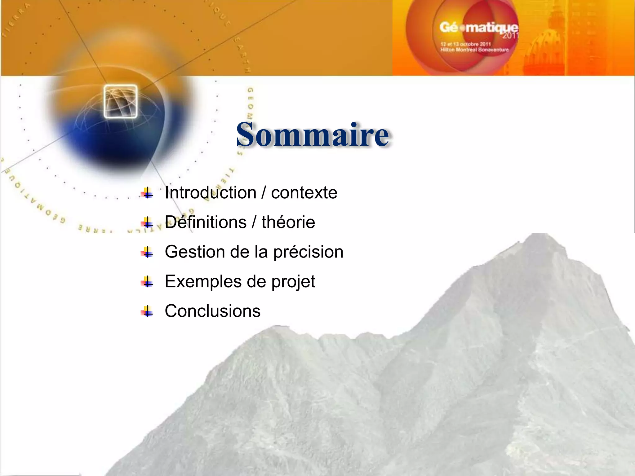 Le document traite de la gestion de la précision dans les projets géomatiques, en soulignant l'importance de définir des standards et de mesurer la qualité des données. Il présente divers types d'erreurs, ainsi que des méthodes pour évaluer et garantir la précision des données géospatiales. Les conclusions insistent sur le rôle essentiel des spécialistes en géomatique et la responsabilité des utilisateurs dans la prise de décisions influençant la qualité des données.