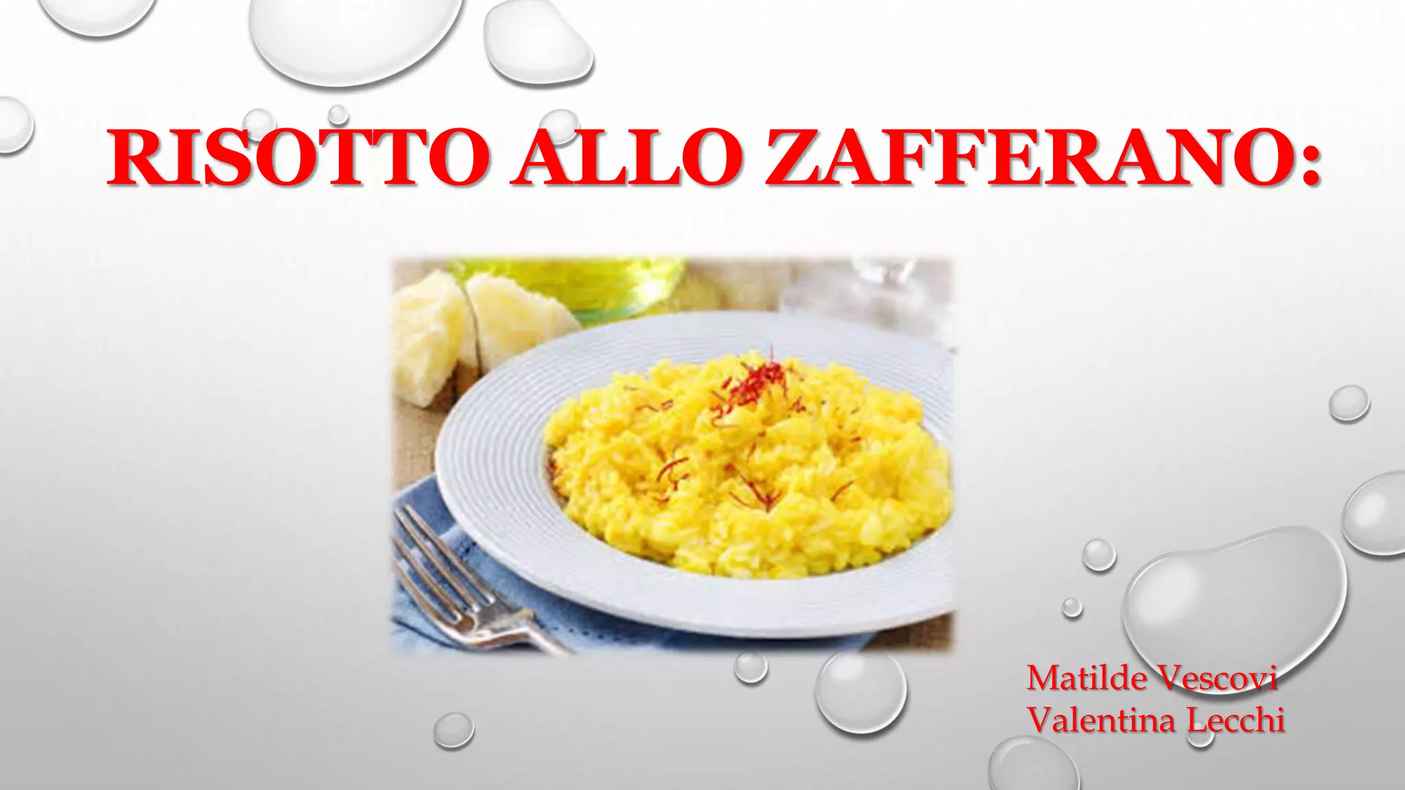 Le document présente une recette de risotto allo zafferano, comprenant des ingrédients comme du riz carnaroli, du safran, et du bouillon. La préparation implique de faire revenir un oignon avec du beurre et de la moelle de boeuf, puis d'ajouter le riz et les autres ingrédients tout en incorporant progressivement du bouillon. La recette se termine avec l'ajout de beurre et de grana padano pour obtenir une texture crémeuse.