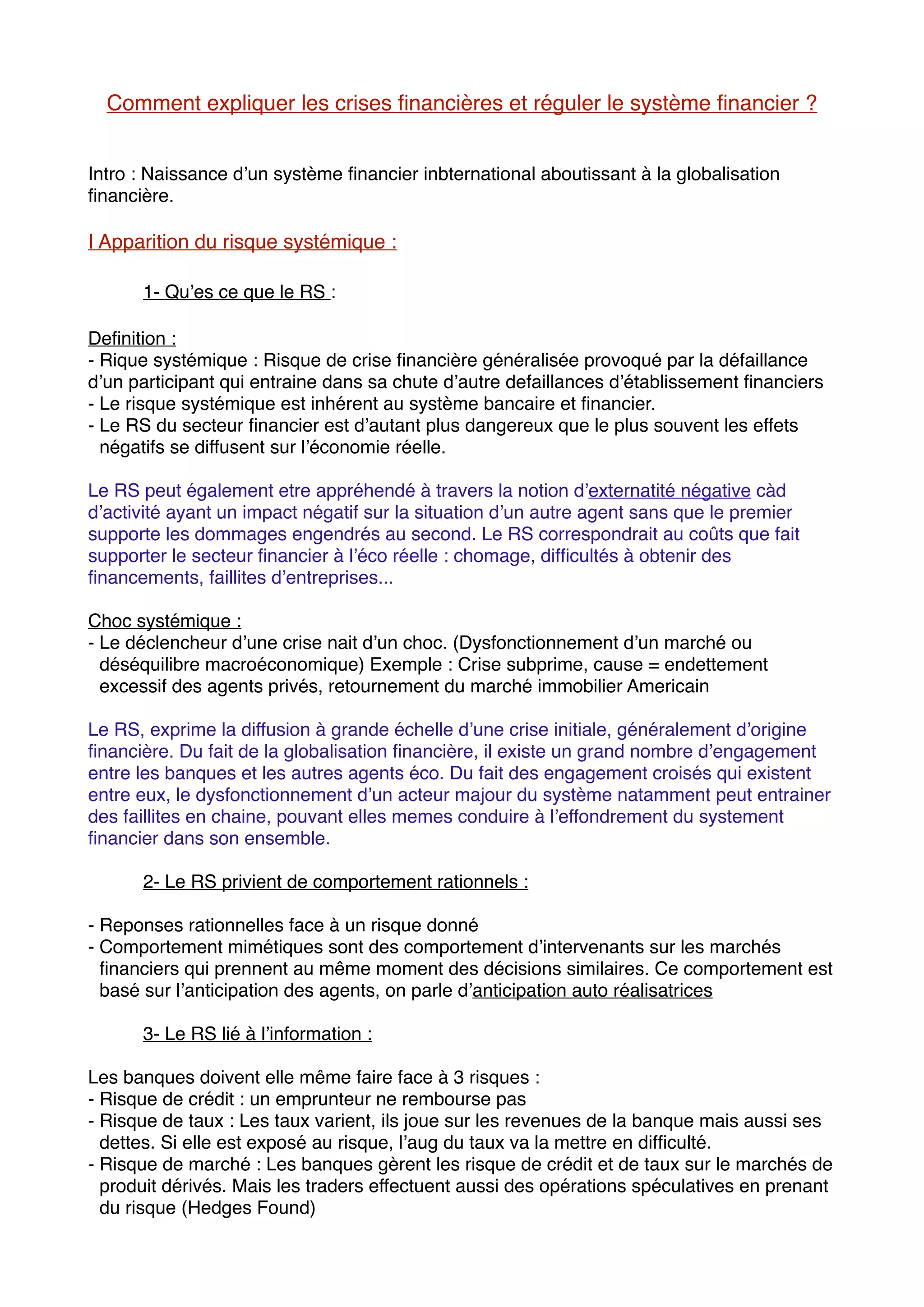 Le document examine le risque systémique dans le système financier mondial, souvent amplifié par la globalisation et les comportements mimétiques des acteurs du marché. Il souligne la nécessité de réguler les marchés financiers pour prévenir les crises économiques, comme en témoigne la crise des subprimes, et décrit les nouvelles régulations mises en place depuis pour renforcer la résilience des banques. Enfin, il aborde le rôle des banques centrales et l'importance d'une gouvernance mondiale pour surveiller et gérer les risques financiers.