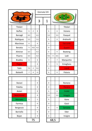 Le document présente des statistiques des performances de joueurs de football pour plusieurs matchs, indiquant les notes attribuées à chaque joueur. Il contient des sections sur les joueurs titulaires et remplaçants, ainsi que des scores individuels et collectifs. Les notes varient entre les différents matchs, reflétant les performances des joueurs dans chaque rencontre.