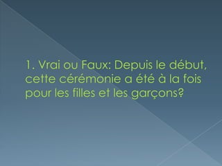 Le document discute des rites de passage dans différentes religions, notamment la transition de l'enfance à l'âge adulte, et des différentes cérémonies associées comme le bar ou bat mitzvah et le baptême chrétien. Il aborde les significations des rituels, leurs implications sociales et religieuses, ainsi que les responsabilités qui en découlent pour les parents. Le texte contient également des questions et des considérations sur l'importance de ces rituels dans la vie des individus et des communautés.