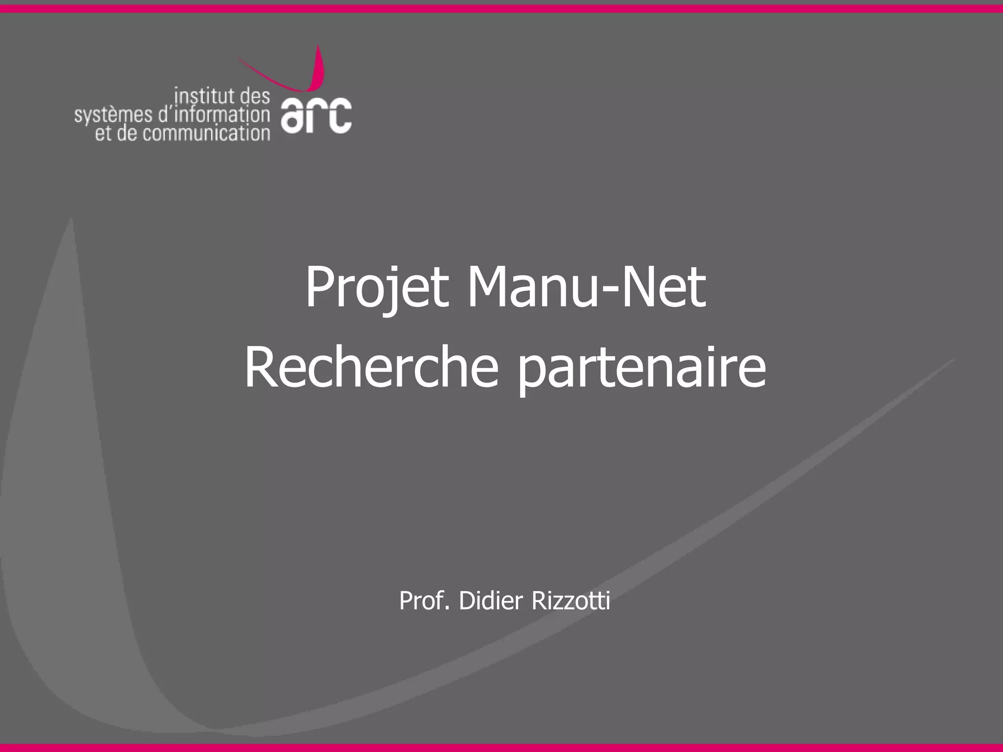 Le projet Manu-Net, dirigé par le professeur Didier Rizzotti, vise à enrichir les plans en ingénierie avec des éléments de réalité augmentée pour améliorer la visualisation d'informations techniques et non techniques. Il recherche des partenaires, en particulier des entreprises suisses et françaises, ayant des compétences dans le secteur de l'industrie des machines et des logiciels. Les principaux axes de recherche incluent l'analyse d'images, la visualisation de données et les systèmes communicants.