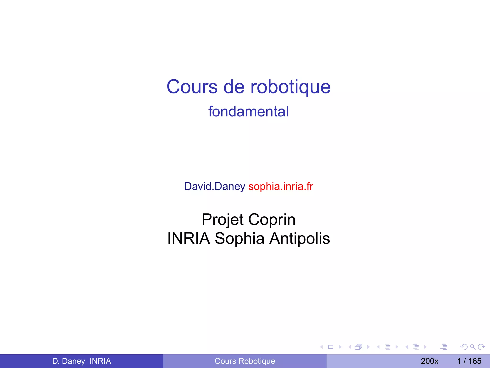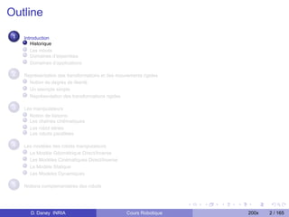 Le document présente un cours sur la robotique, décrivant son histoire et ses applications à travers les âges, des mythes antiquités aux avancées contemporaines. Il traite des notions techniques fondamentales comme les transformations rigides, les manipulateurs, et les modèles dynamiques des robots. En outre, il clarifie la définition d'un robot et explore sa progression historique, en soulignant des milestones clés et des contributions significatives dans le domaine.