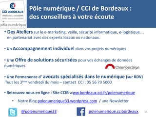 Le document présente une série d'ateliers et de ressources liés au e-marketing, à la sécurité informatique et à la dématérialisation pour accompagner les entreprises dans leur transformation numérique. Il souligne l'importance d'une présence en ligne et d'outils adaptés pour optimiser les relations entre commerçants et consommateurs dans un monde de plus en plus digitalisé. Des conseils pratiques sur la création et la gestion de sites web ainsi que sur le référencement sont également fournis pour aider les entreprises à se démarquer sur Internet.