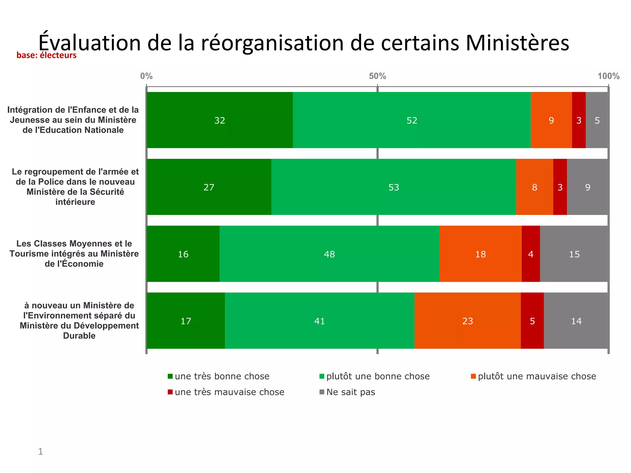 Le document évalue la réorganisation de certains ministères, notamment l'intégration de l'enfance et de la jeunesse au ministère de l'éducation nationale et le regroupement de l'armée et de la police sous le ministère de la sécurité intérieure. Il présente également des opinions des électeurs sur la composition du gouvernement, soulignant que des ministres ne se sont pas présentés à l'électorat et que des préoccupations existent concernant la nomination de secrétaires d'État. Les résultats indiquent une compréhension mitigée des décisions des partis concernant les nominations et les logiques d'attribution des postes.