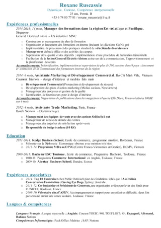 Roxane Ruscassie, dynamique et curieuse, possède une expérience professionnelle variée en management de formations, marketing et développement commercial, principalement en Asie et en Europe. Elle a travaillé pour des entreprises telles que General Electric et Bosch Siemens, et a réalisé des accomplissements significatifs, notamment en organisant plus de 200 sessions de formation à l'international. Diplômée de Kedge Business School avec des compétences en langues et en gestion, elle a également cofondé une organisation de levée de fonds pour l'UNICEF.