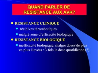 Le document traite de la résistance aux antivitamines K (AVK), y compris les raisons cliniques et biologiques de cette résistance, ainsi que les facteurs contribuant à celle-ci. Différentes causes de résistance sont explorées, tel que l'excès de vitamine K, des erreurs de laboratoire, et des facteurs génétiques. Enfin, le texte aborde l'importance de la gestion des doses et de l'absorption des médicaments pour éviter les complications thrombotiques.