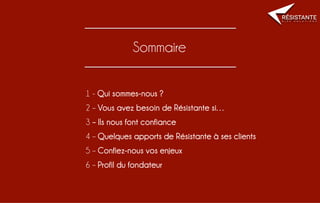 Le cabinet Résistante est un expert en sécurité globale du développement des entreprises, offrant des solutions en management des risques à travers un réseau de 52 consultants certifiés en Europe et dans le monde. Ils aident les entreprises à optimiser leurs investissements en sécurité, se conformer aux normes internationales et améliorer leur résilience face aux crises. Fondé par Sylvan Ravinet, le cabinet se concentre sur la gestion de la continuité des affaires et la protection du patrimoine informationnel.