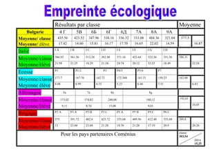 Le document présente les résultats d'évaluation par classe et par élève pour plusieurs pays, incluant la Bulgarie, l'Italie, l'Écosse, l'Allemagne et la Belgique. Chaque section fournit la moyenne des scores par classe et par élève, mettant en évidence les différences de performance entre les pays. En outre, les résultats des pays partenaires Comenius sont également inclus, montrant une moyenne de 303,54 pour les classes et 15,25 pour les élèves.