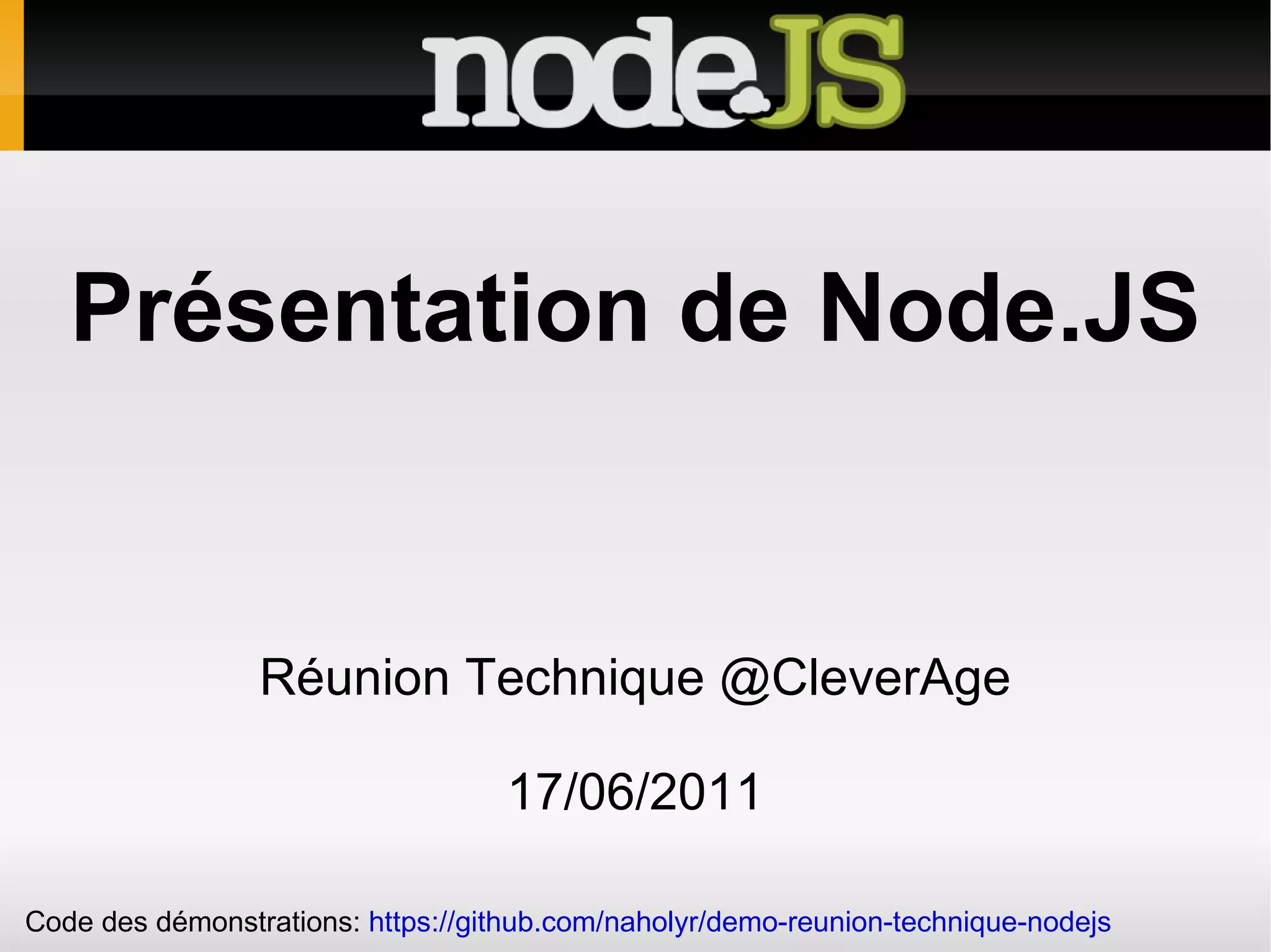 La présentation de Node.js discute de son utilisation comme moteur JavaScript côté serveur performant, basé sur le moteur V8 de Chrome et une API asynchrone. Elle met en avant sa communauté dynamique, des ressources et des démonstrations de projets en production. Enfin, le document aborde les fonctionnalités de gestion des modules via npm et des techniques de programmation asynchrone pour améliorer les performances des applications web.