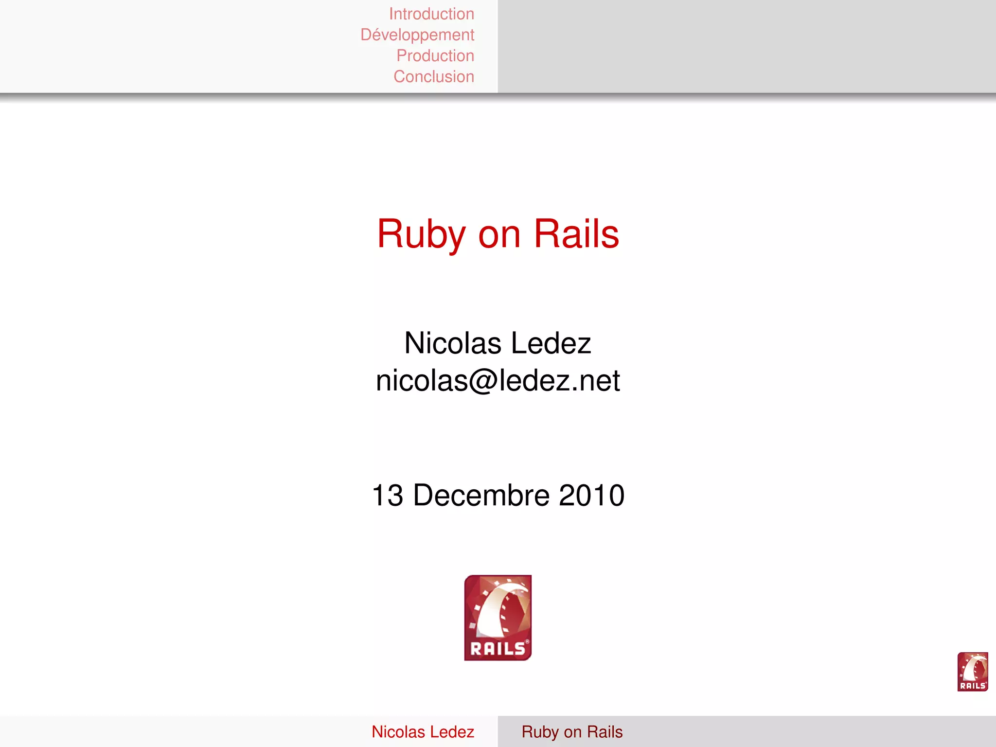 Ce document présente un aperçu du framework Ruby on Rails, en détaillant son historique, ses outils de développement, et ses processus de production. Il aborde les défis rencontrés lors du développement et de la mise en production des applications. Enfin, le document conclut par une réflexion sur les questions et les défis liés à l'utilisation de Ruby on Rails.