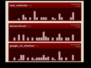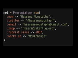 Le document présente Ruby comme un langage de programmation d'avenir, en abordant son histoire et son évolution par rapport à d'autres langages. Il évoque également l'installation de Ruby sur différentes plateformes ainsi que plusieurs frameworks associés au développement web et mobile. Des groupes d'utilisateurs Ruby dans le monde, en particulier aux États-Unis et en Afrique, sont également mentionnés.