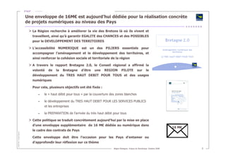 Le document présente une initiative visant à améliorer l'accessibilité numérique en Bretagne à travers une enveloppe de 16 millions d'euros destinée à des projets numériques. Cette démarche comprend deux étapes : sensibilisation des territoires aux enjeux numériques et définition de stratégies d'aménagement numérique. L'objectif est de garantir l'égalité des chances et de renforcer la cohésion sociale tout en développant des infrastructures et usages adaptés aux besoins des territoires.