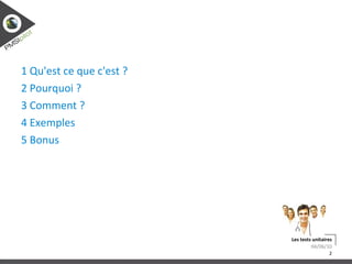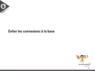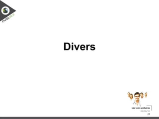 Le document traite des tests unitaires, expliquant leur définition, leur importance et les méthodes utilisées dans Symfony 1.x pour les réaliser. Il aborde également des fonctions utiles, des exemples pratiques, et fournit des conseils pour corriger des bugs et rendre le code testable. Enfin, il évoque la couverture des tests et la manière de les exécuter.