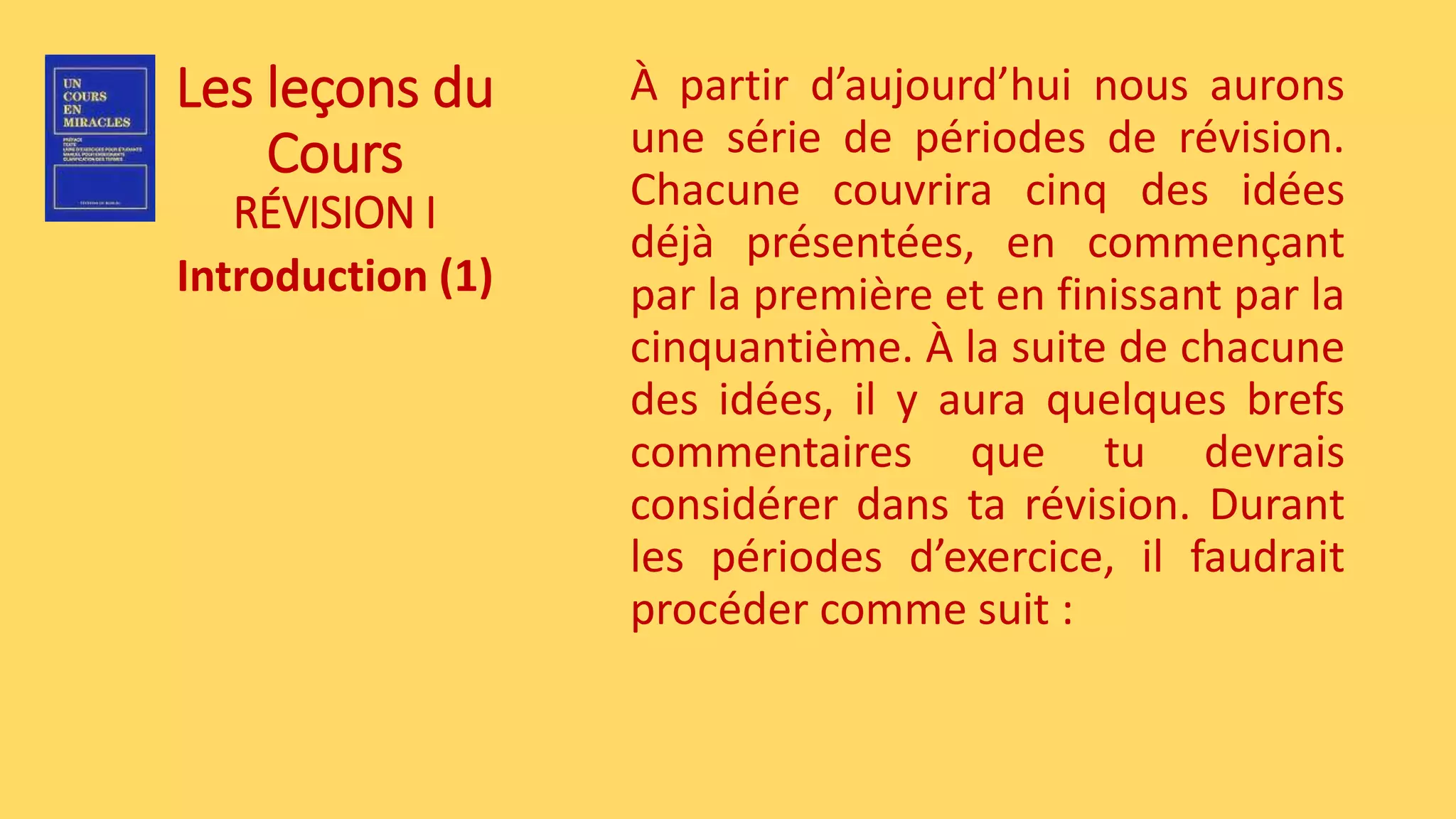 Ce document décrit une série de périodes de révision portant sur cinquante idées déjà présentées, accompagnées de brefs commentaires à considérer. Les exercices doivent être effectués de manière flexible, en se concentrant sur les idées favorisées tout en assurant une révision complète à la fin de la journée. L'apprentissage vise à intégrer la paix intérieure dans diverses situations, sans chercher l'isolement.