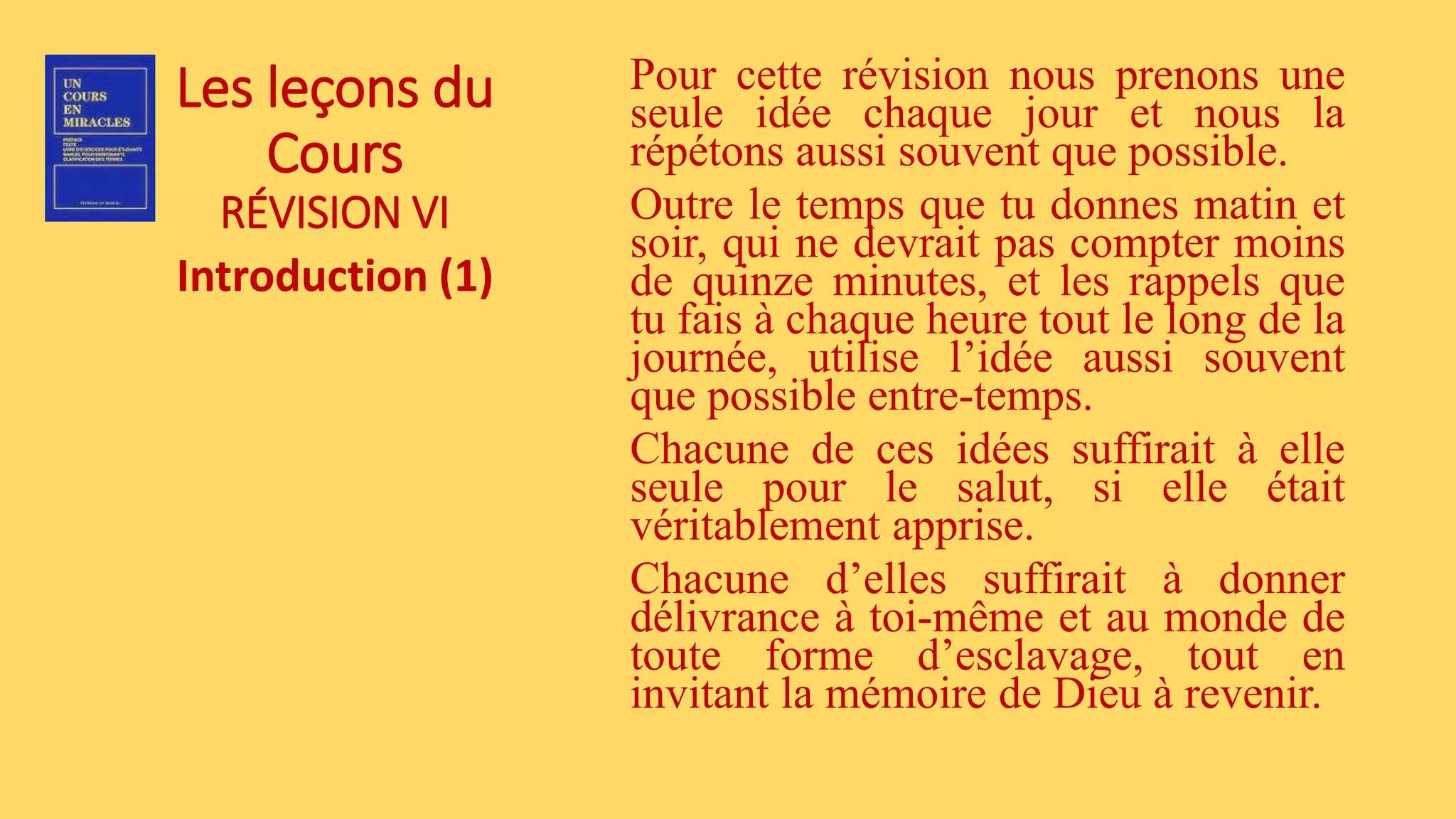 Le document présente une méthode de révision centrée sur l'idée que l'individu n'est pas son corps et qu'il est libre, en soulignant l'importance de répéter une seule idée chaque jour pour favoriser l'apprentissage et la délivrance spirituelle. Il encourage à laisser de côté toutes pensées négatives et à se concentrer sur l'idée du jour, tout en s'appuyant sur l'enseignement silencieux du Saint-Esprit. Ces exercices permettent de se rapprocher de la paix divine en abandonnant les pensées encombrantes et en acceptant une vérité plus profonde.