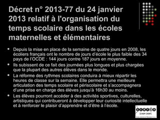 Le document aborde la réforme des rythmes scolaires en France, soulignant que les écoliers ont actuellement l'un des nombres de jours d'école les plus bas de l'OCDE. Cette réforme vise à équilibrer les heures de classe sur la semaine et à enrichir les activités périscolaires pour développer l'intérêt des élèves. Le CRDP propose un accompagnement aux municipalités avec des ressources adaptées et des formations pour les intervenants.