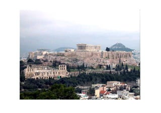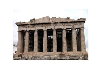 Le document aborde les civilisations grecques, notamment les périodes géométrique, archaïque, classique et hellénistique, ainsi que l'évolution de l'art et de l'architecture dans ces contextes. Il décrit les différents ordres architecturaux (dorique, ionique, corinthien) et examine des monuments emblématiques tels que le Parthénon et le temple de Zeus à Olympie. Enfin, il aborde les éléments ornementaux et la planification urbaine des villes grecques.