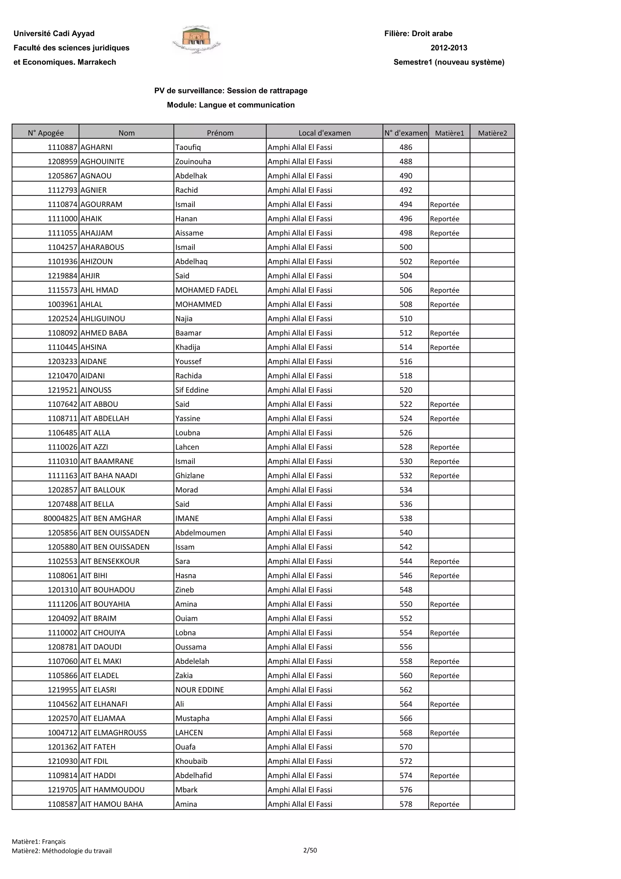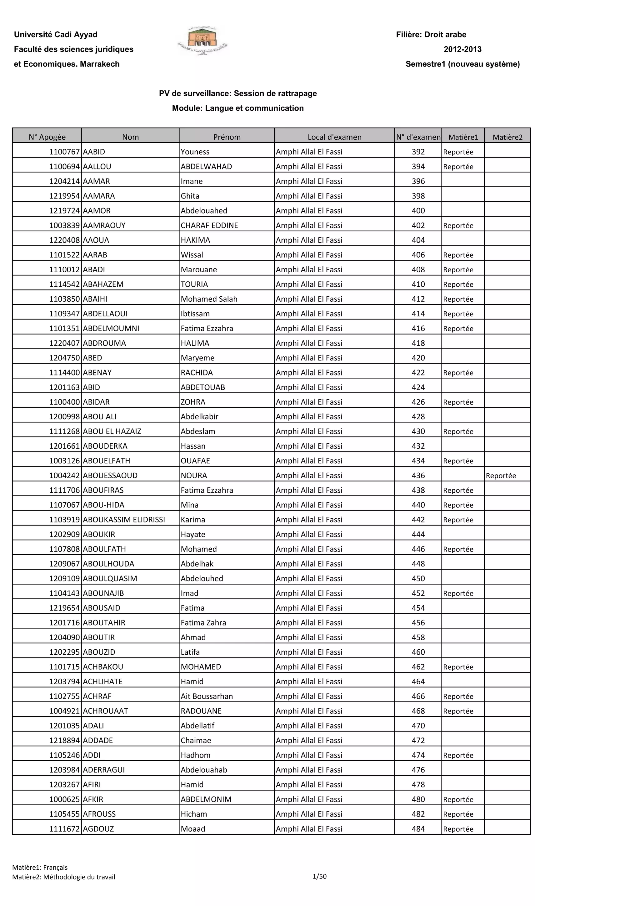 Le document présente une liste d'étudiants de la filière droit arabe à l'Université Cadi Ayyad, comprenant leurs numéros d'apogée, noms, prénoms, salles d'examen, numéros d'examen, ainsi que les matières concernées. La majorité des examens sont signalés comme reportés, indiquant potentiellement des retards dans l'évaluation académique. La liste fait partie d'un procès-verbal de surveillance pour une session de rattrapage pour le module de langue et communication de l'année universitaire 2012-2013.