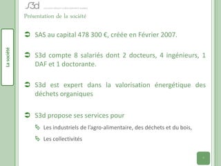 La société S3D, créée en 2007 avec un capital de 478 300 €, se spécialise dans la valorisation énergétique des déchets organiques, en offrant des services aux secteurs agro-alimentaire, déchets et collectivités. Elle propose des diagnostics, études de faisabilité et accompagnement méthodologique, ainsi que des programmes de recherche et développement liés à la méthanisation et la production de biométhane. S3D a réalisé plusieurs études et projets, notamment en Limousin et à la Réunion, pour optimiser les pratiques de gestion des déchets.