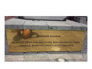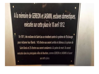 Le document décrit divers lieux et monuments importants dans une région, notamment le mémorial des engagés indiens et la mémoire d'esclaves exécutés. Il mentionne également des rues, une mosquée, un temple bouddhiste, et le marché forain. L'ensemble projette une image de l'urbanisme et des points d'intérêt culturel et historique de Saint-Denis.
