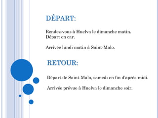 Le projet de voyage pour un groupe scolaire inclut un départ en car de Huelva vers Saint-Malo, avec un retour prévu le lendemain. Le séjour de 8 jours comprend des visites de la vieille ville de Saint-Malo, de Rennes, et du Mont Saint-Michel, ainsi que des activités comme une balade en bateau et une promenade contée. Les repas et l'hébergement en auberge de jeunesse sont pris en charge par les organisateurs.