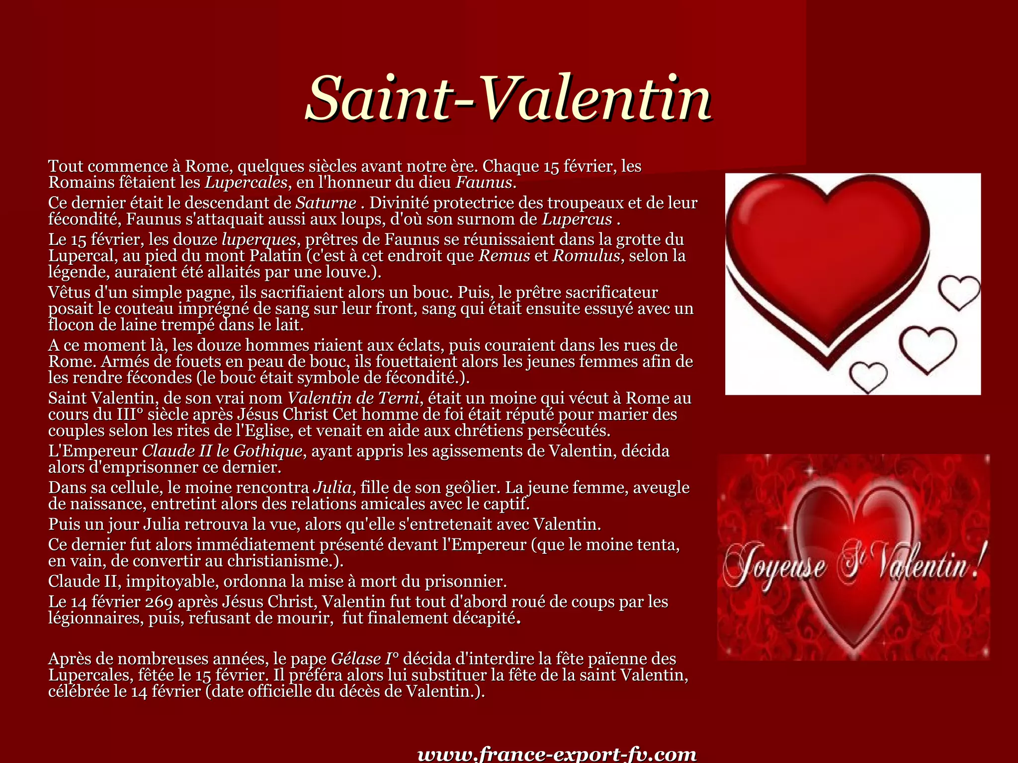 Le document traite des origines de la Saint-Valentin, commençant par des festivités romaines en l'honneur du dieu Faunus, et évoque Saint Valentin, un moine martyrisé pour avoir marié des couples. Il offre également des recettes pour célébrer cette fête, incluant des plats variés comme un potage, un tartare de crevettes et des desserts. La transition de la fête païenne des Lupercales à celle de la Saint-Valentin est également mentionnée.
