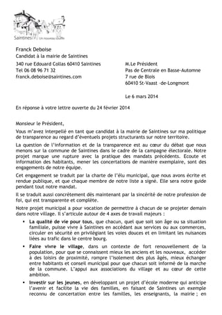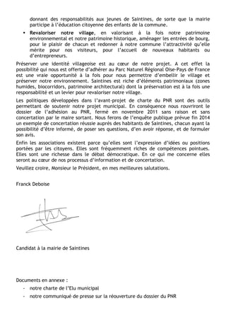 Franck Deboise, candidat à la mairie de Saintines, met l'accent sur la transparence et l'écoute des habitants dans son projet municipal, en réponse à une critique de la politique actuelle. Son programme se concentre sur quatre axes : la qualité de vie, la dynamique communautaire, l'investissement sur les jeunes et la valorisation du patrimoine. Il s'engage à rouvrir le dossier d'adhésion au parc naturel régional pour améliorer le village et à organiser une enquête publique exemplaire afin de garantir la participation des citoyens.