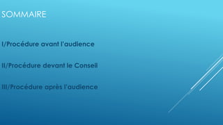 Le document décrit la procédure de saisine des conseils de prud’hommes, qui traitent des litiges entre salariés et employeurs. La saisine peut se faire par une demande formelle ou par la présentation volontaire des parties, avec un timbre fiscal de 35 €. Il couvre également la tentative de conciliation et les étapes du procès, jusqu'à la décision du conseil qui doit être respectée par les parties.