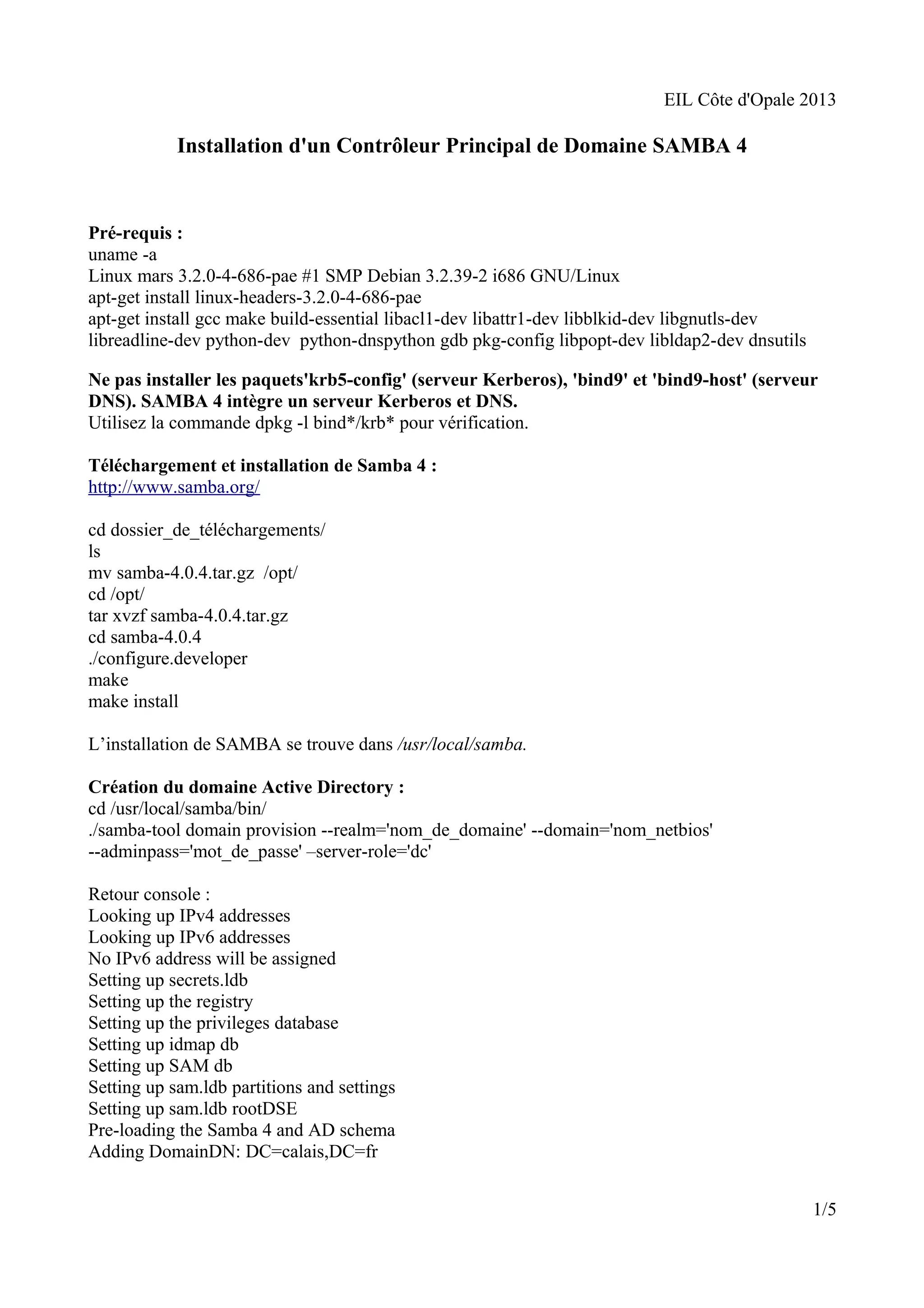 Le document décrit l'installation et la configuration d'un contrôleur de domaine Samba 4 sur un système Linux, incluant les pré-requis et les étapes nécessaires pour créer un domaine Active Directory. Il détaille également la configuration de Kerberos et l'utilisation des outils d'administration sous Windows pour gérer le serveur Samba. Enfin, il fournit des commandes pour vérifier le bon fonctionnement des services et des instructions pour ajouter des utilisateurs au domaine.