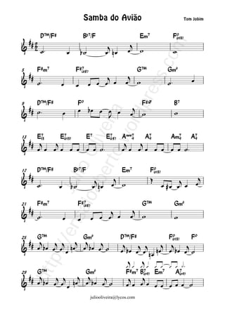 Le document semble être une transcription ou une partition de la chanson 'Samba do Avião' de Tom Jobim, contenant des notations musicales et des accords. Il inclut également des mentions d'adresses e-mail, des répétitions et des instructions pour la performance musicale. La structure du texte fait apparaître des éléments typiques des écrits musicaux, sans contexte explicite sur les interprétations ou les analyses.