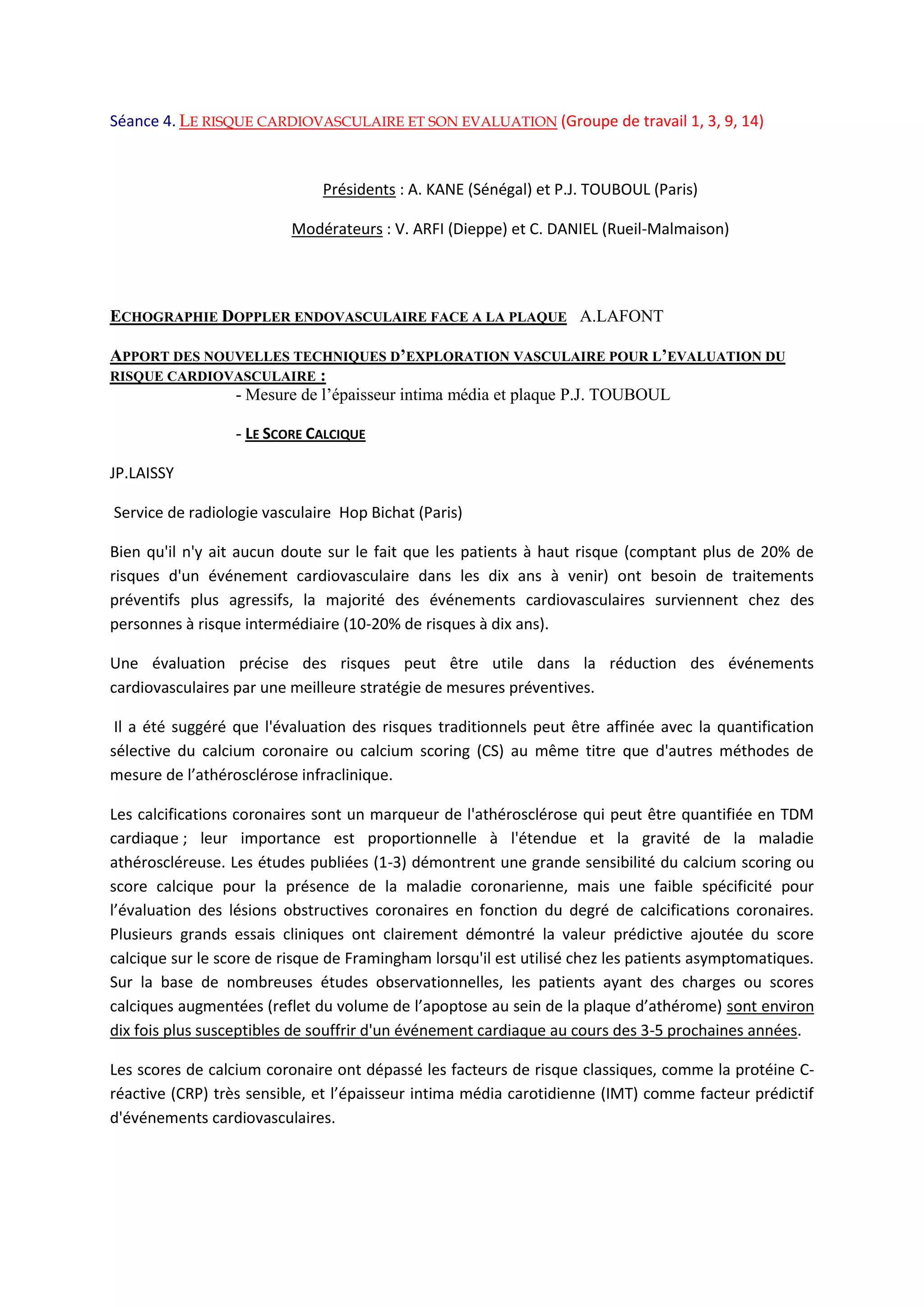 Le document traite du risque cardiovasculaire et de son évaluation, en mettant l'accent sur l'importance de techniques telles que le calcium scoring pour prédire les événements cardiovasculaires, surtout chez les patients à risque intermédiaire. Il aborde également l'impact du diabète sur le risque d'accidents ischémiques cérébraux, soulignant que ce facteur aggrave les complications neurologiques liées aux sténoses carotidiennes. En pratique, une évaluation approfondie des risques hémodynamiques est cruciale pour orienter les décisions chirurgicales chez les patients diabétiques.