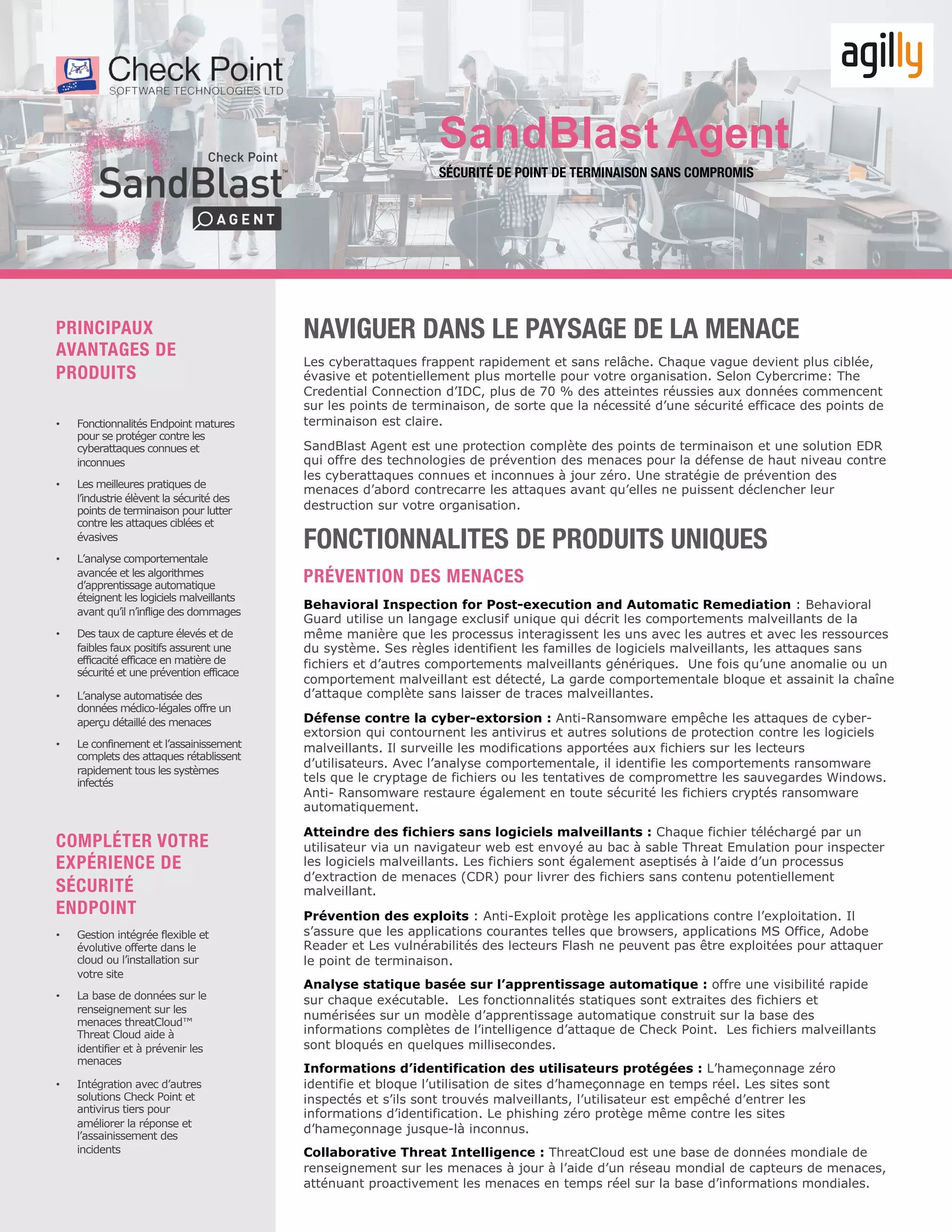 Le Sandblast Agent est une solution de sécurité pour les points de terminaison, offrant une protection complète contre les cyberattaques à l'aide de technologies de prévention avancée, d'analyse comportementale et de réponse automatisée aux incidents. Il fournit des fonctionnalités telles que la détection de ransomware, la protection contre l'hameçonnage, et l'émulation de menaces pour assurer une sécurité de haute qualité. Intégré dans l'architecture de cybersécurité Check Point Infinity, il vise à contrer les menaces évolutives et à garantir la sécurité des données sur divers systèmes d'exploitation.