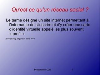 Le document présente une introduction aux réseaux sociaux, définissant leur nature interactive et les types d'échanges qu'ils facilitent. Il fournit également des informations sur les dates de création et le nombre d'utilisateurs de divers réseaux sociaux comme Facebook, Google+, LinkedIn, et Viadéo. Enfin, il illustre l'évolution du nombre d'utilisateurs de Facebook au fil des ans.