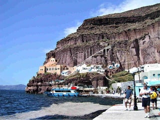 Santorin est une île volcanique en Grèce, située dans l'archipel des Cyclades, célèbre pour son éruption en 1590 avant J.C. Les dernières éruptions ont eu lieu entre 1866 et 1950, principalement à Néa Kameni. L'île est décrite comme un paradis sur terre.