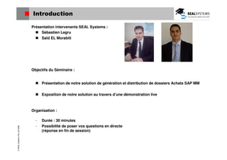 Le séminaire de Seal Systems présente une solution de génération et de distribution de dossiers d'achats pour SAP MM, visant à optimiser la gestion documentaire et réduire les erreurs. Il met en avant les fonctions du système de gestion de documents SAP, notamment la création, la classification et la diffusion sécurisée de documents liés aux processus métiers. La solution est intégrée à l'environnement SAP, permettant une automatisation et une réduction des coûts dans la gestion opérationnelle des dossiers.