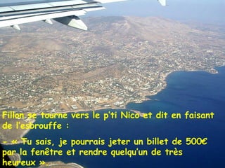 Dans un vol au-dessus de la France, Nicolas Sarkozy, François Fillon et le député Eric Raoult discutent de la manière de rendre les gens heureux en jetant de l'argent par la fenêtre. Chacun d'eux propose une somme d'argent, mais le pilote se moque d'eux en déclarant qu'il pourrait se débarrasser de trois d'entre eux pour apporter le bonheur à des millions. Cette scène met en lumière l'arrogance des politiciens face à la réalité.