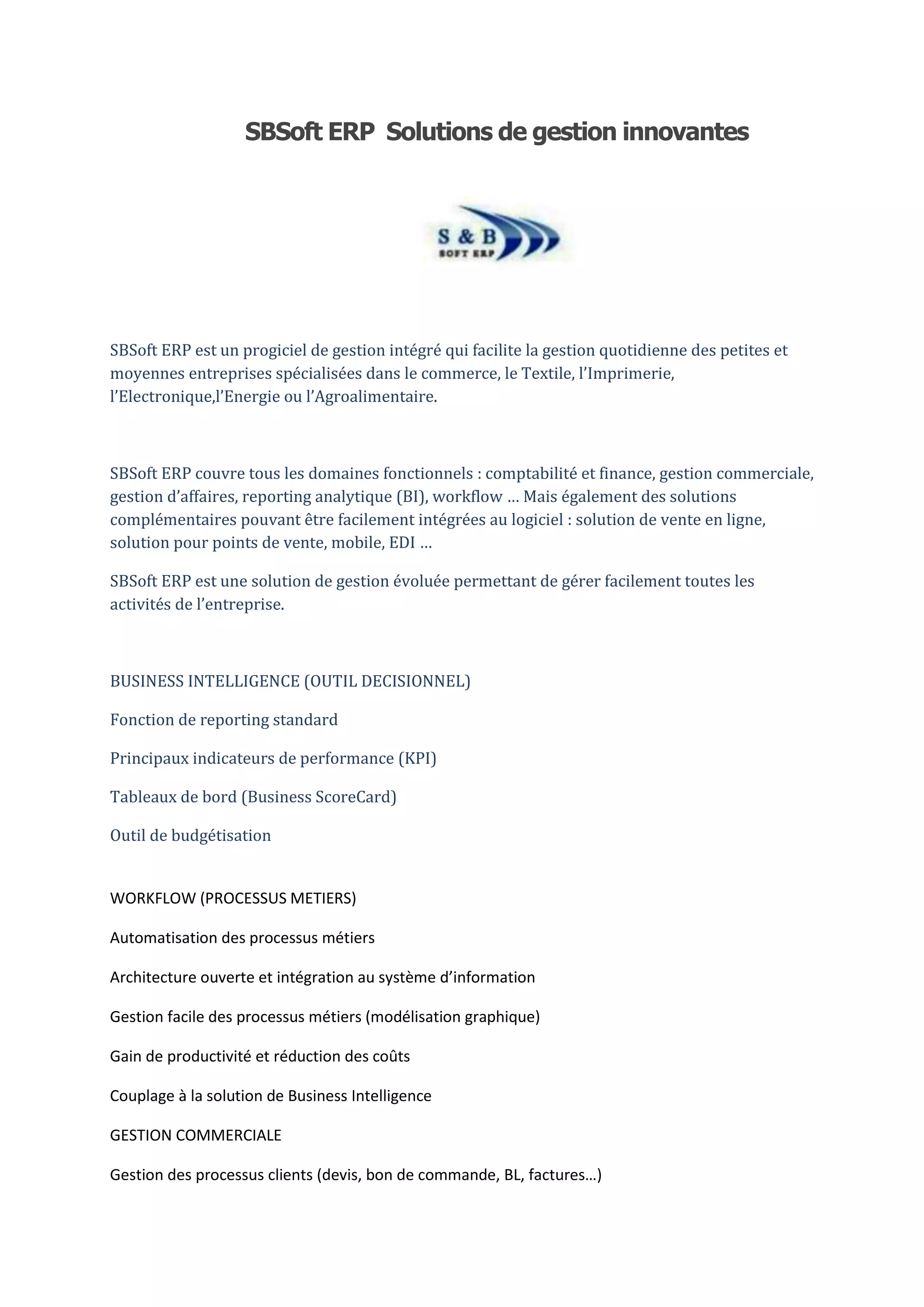 SBSoft ERP est un progiciel de gestion intégré pour les PME, couvrant divers domaines fonctionnels tels que la comptabilité, la gestion commerciale et la logistique, tout en offrant des solutions complémentaires. Il permet une gestion simplifiée et personnalisée des processus métiers, favorisant la productivité et la traçabilité, et est conçu pour s'adapter aux besoins spécifiques des entreprises. Avec des fonctionnalités avancées comme la business intelligence et la gestion de la production, SBSoft ERP aide les entreprises à optimiser leurs opérations tout en réduisant les coûts.