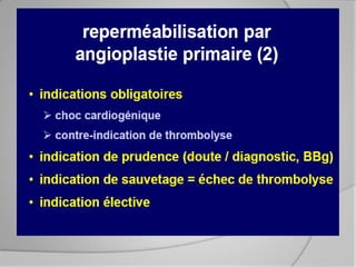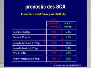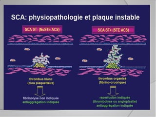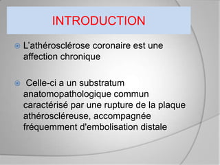 L'athérosclérose coronaire est une affection chronique entraînant des syndromes coronaires aigus (SCA) avec un pronostic réservé malgré les avancées médicales. Le diagnostic repose sur des critères cliniques, ECG et biochimiques pour évaluer l'urgence des traitements, notamment en phase préhospitalière où la rapidité d’intervention est cruciale. Les stratégies thérapeutiques incluent des options comme la thrombolyse et l'angioplastie pour assurer la perméabilité des artères et améliorer le pronostic des patients.