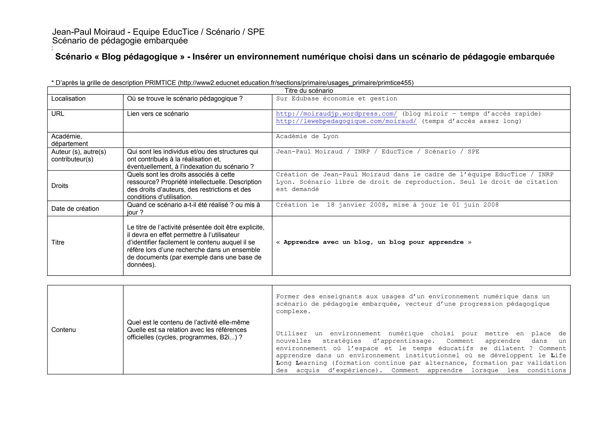 Ce document présente un scénario de pédagogie embarquée centré sur l'utilisation des blogs comme environnement numérique d'apprentissage. Destiné aux enseignants, il vise à structurer des activités pédagogiques collaboratives et à développer des compétences numériques et pédagogiques dans un contexte éducatif en évolution. Il aborde également les méthodes de certification et les enjeux administratifs liés à l'enseignement en France.